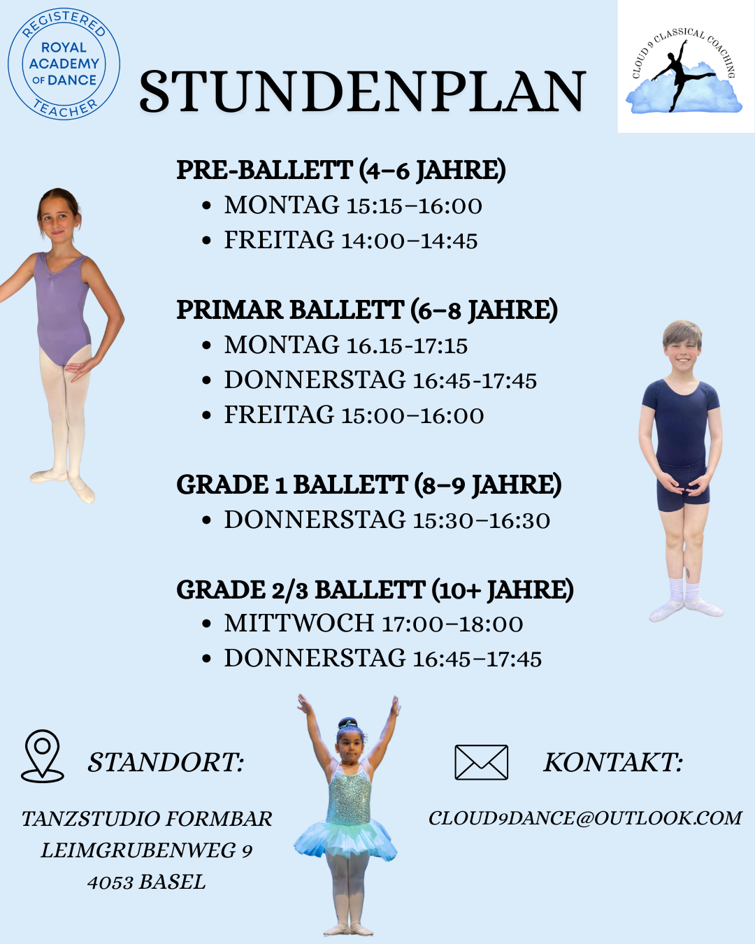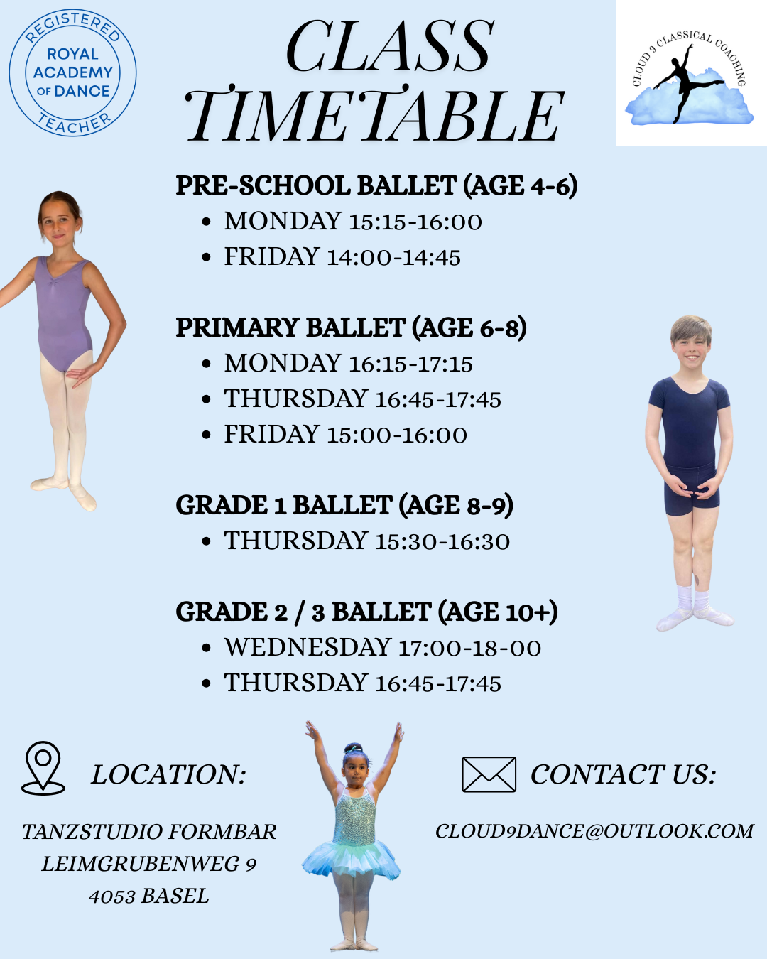 I am very excited to share some special news with you. Cloud 9 Classical Coaching (the ballet school within Tanzstudio Formbar) has officially been recognised and registered as the first Royal Academy of Dance (RAD) Ballet School in Basel. As a qualified RAD teacher for over seven years, I am thrilled to now be able to offer your children the opportunities and recognition that come with this internationally respected organisation.